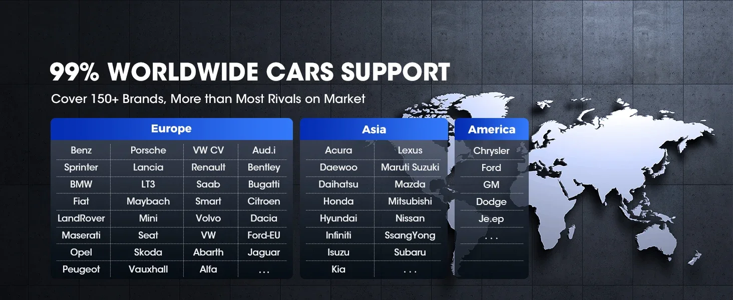 Unlike factory and dealer tools that can work only for certain vehicles with limited functionalities, Autel scanner MK808S for all cars has complete database covering 99% of vehicles from 150+ diverse brands / 10,000 models