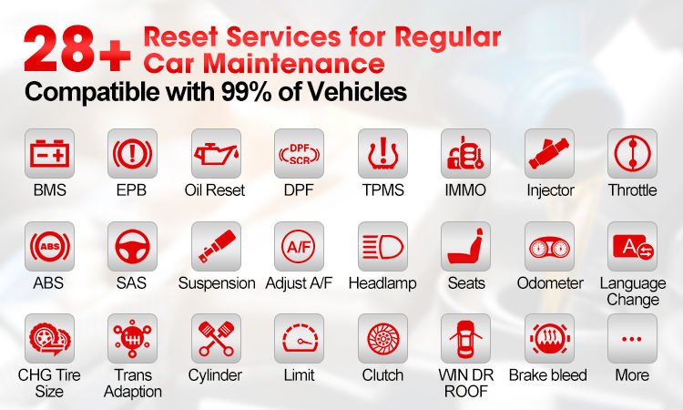 Reset, EPB (Electronic Parking Brake), SAS (Steering Angle Sensor), BMS (Battery Management System), DPF (Diesel Particulate Filter), IMMO, and TPMS (Tire Pressure Monitoring System).